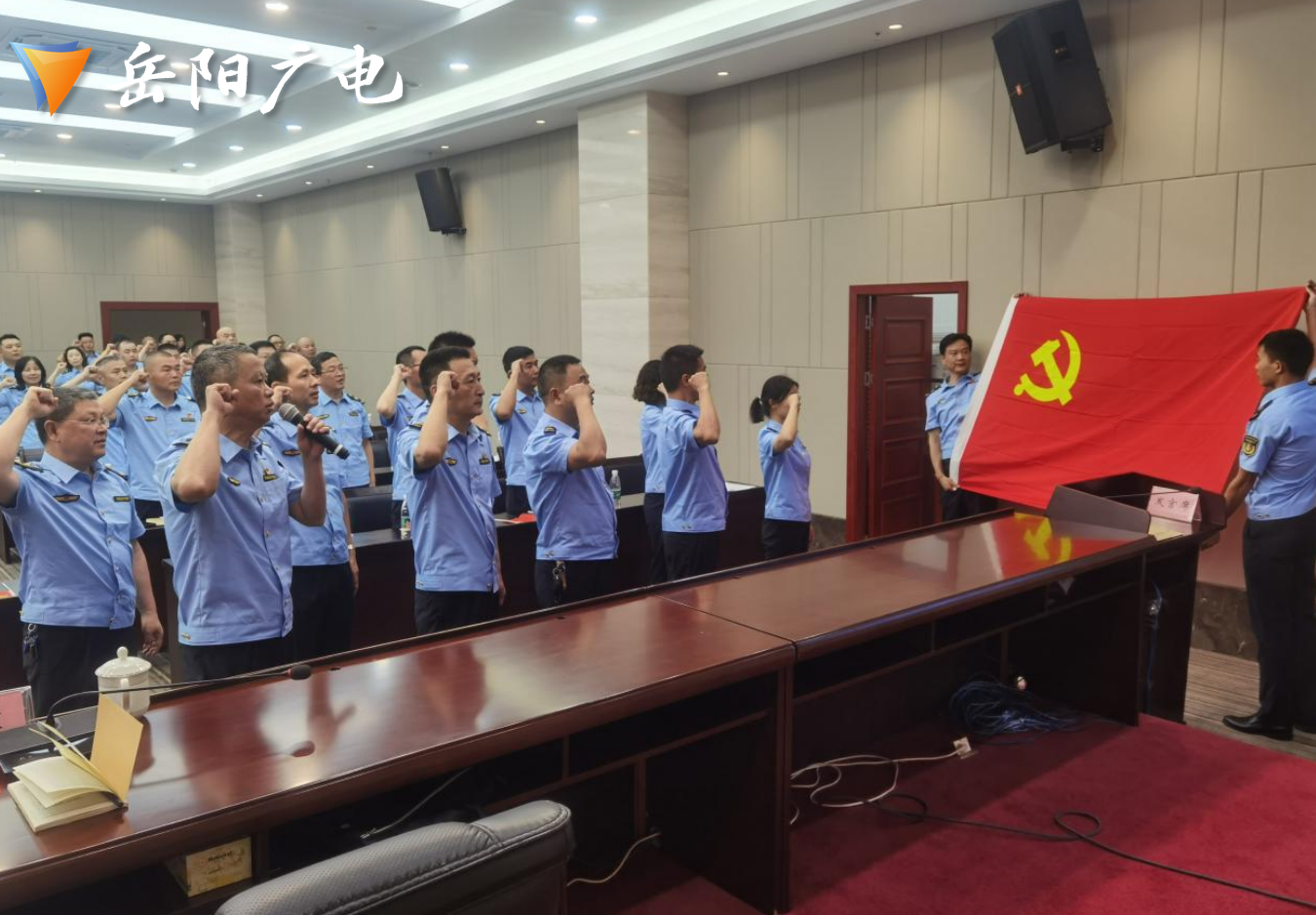 随后,伴随着雄壮激昂的国歌,全场庄严肃立。在支队党委委员、副支队长唐向明带领下,6名新发展预备党员进行了入党宣誓,全体与会党员高举右手,面向鲜红的党旗,重温了入党誓词。