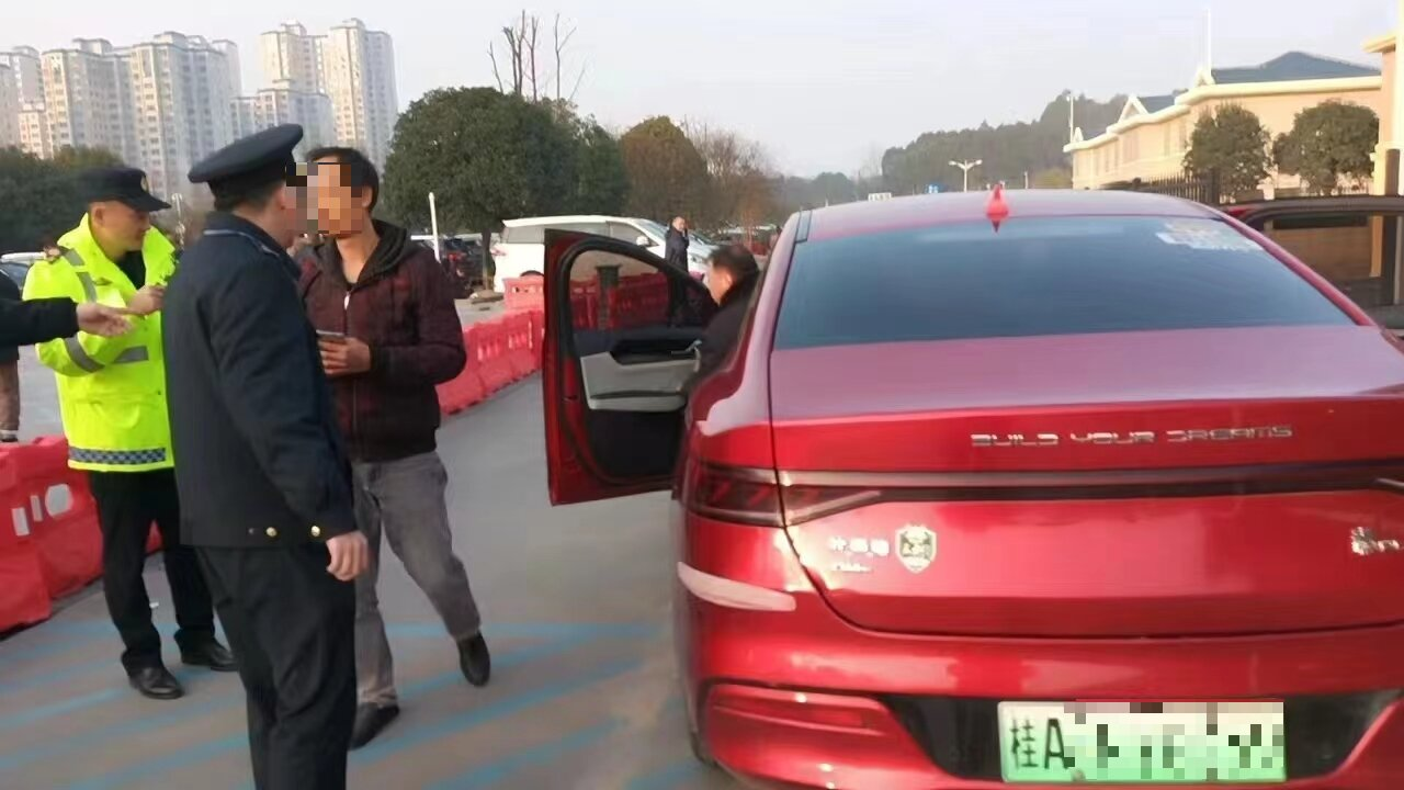 近日,岳阳市交通运输综合行政执法支队执法人员在岳阳东站网约车上车点例行巡查,一台桂a牌照的纯电动轿车引起了执法人员的注意。经现场询问乘客得知,李某驾驶该车去湖北省石首市,车上四名乘客为一家人(老公、妻子及两名小孩),要去湖北江陵县,乘客口述付款300元车费,执法人员当即对该车进行先行登记保存。