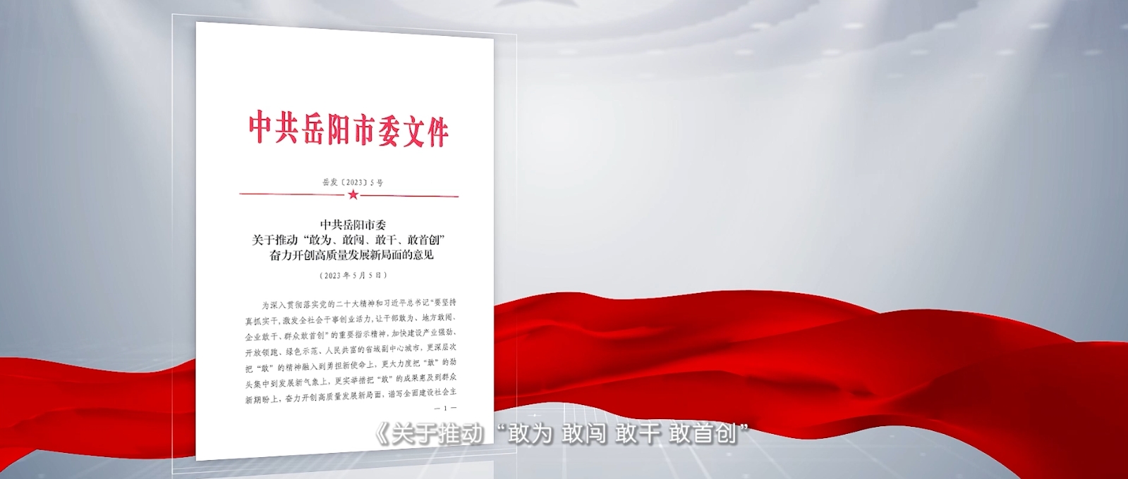 2023年5月,《中共岳阳市委关于推动“敢为、敢闯、敢干、敢首创”奋力开创高质量发展新局面的意见》正式发布,拿出13条硬性措施,大力营造“敢为”良好氛围、提升“敢为”能力本领、完善“敢为”激励措施、打造“敢首创”的平台载体,坚持把“企业家所想的”作为“党委、政府要干的”,推动“国企敢干、民企敢闯、外企敢投”,打造重点产业集群,服务企业转型升级,大力发展新兴产业,迅速形成只争朝夕,大干快上的浓厚干事创业氛围,也为岳阳高质量发展注入了源源不断的动力。