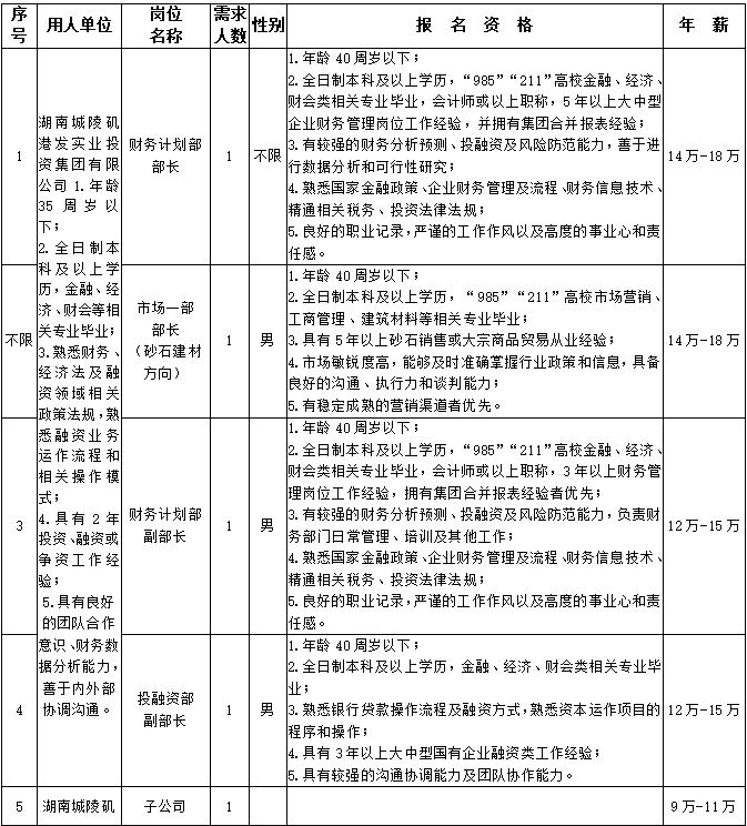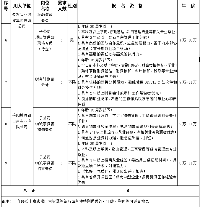 1.本次共面向社会招聘9人,招聘岗位9个。港发集团、口岸公司所聘人员实施企业化管理,凡遵纪守法、职业道德良好,且年龄、学历、专业、资质、工作经验等符合岗位要求的,均可报名参加。