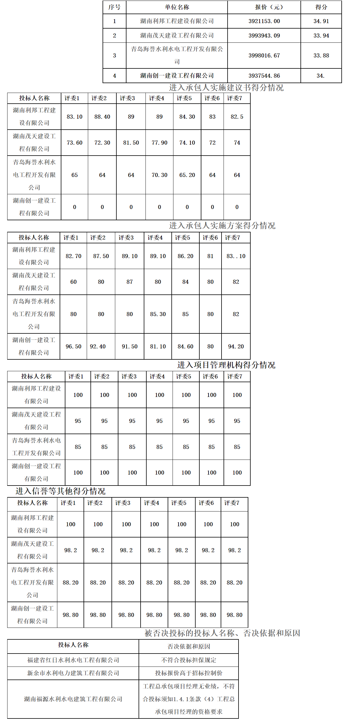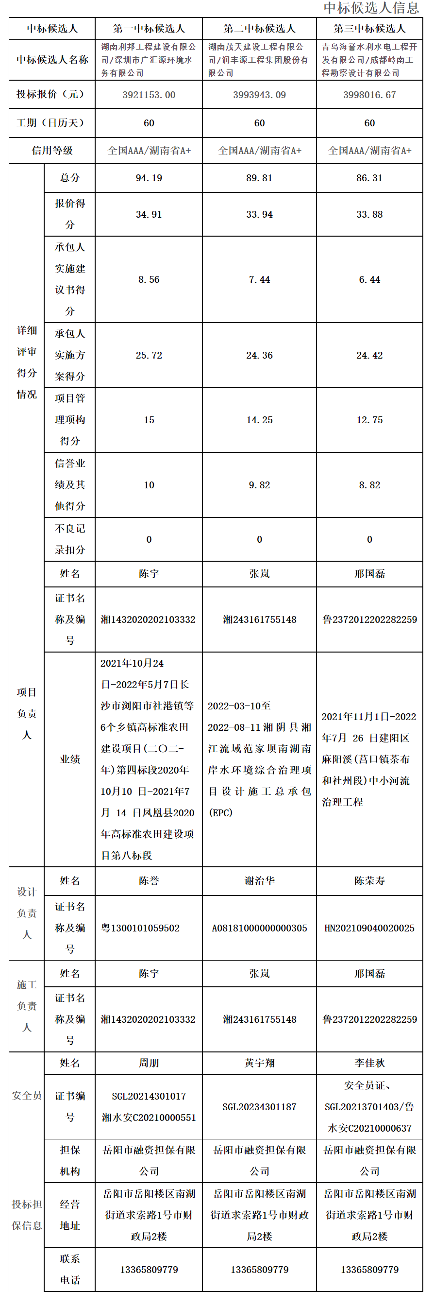 湖南宸宇项目管理有限公司受湘阴县水利工程项目服务中心的委托,代理2023年湘阴县农业水价综合改革计量设施建设项目设计施工总承包招标,2024年01月23日上午09:30分(北京时间)在岳阳市公共资源交易网进行了公开开标,在湘阴县人民政府招标投标领导/湘阴县水利工程项目服务中心领导的监督下,依法组建的评标委员会按照招标文件确定的评标原则和评标办法进行了细致的评审,并推荐本项目中标候选人排名如下: